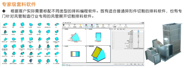 3.對于鈑金或風管展開切割用戶:本設(shè)備可與金林鈑金、CAM-DUCT、Lantek等風管行業(yè)專用軟件實現(xiàn)無縫對接,用戶只需在軟件中選擇鈑金件樣式、輸入簡單的參數(shù),即可自動生成展開件、自動排料、自動生成切割程序,然后調(diào)入到數(shù)控切割機中進行切割加工,使鈑金切割工作更便捷、更高效。